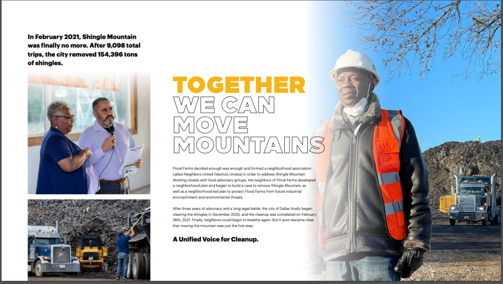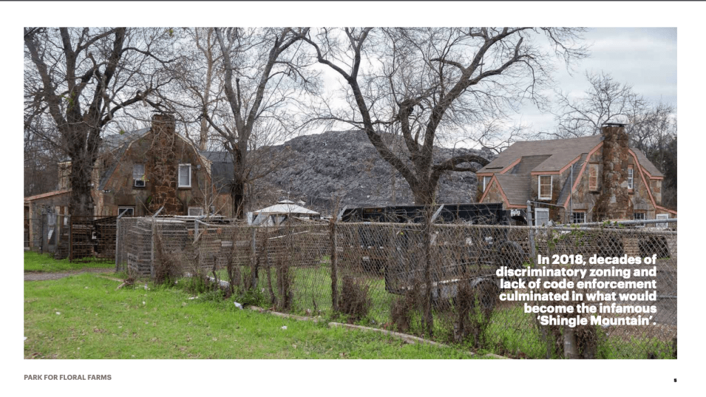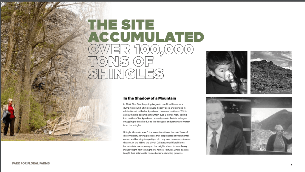 A small neighborhood called Floral Farms in Southern Dallas was thrust into the spotlight when over 100,000 tons of asphalt shingles were illegally dumped in the community, creating a 60-foot-tall ‘Shingle Mountain’.